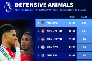 英超球队连续“单场不丢3球”榜:阿森纳121场居首,穆式曼联次席