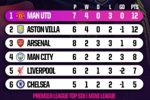 体育资讯1月26日讯 在本轮英超焦点战,曼联3-2击败阿森纳。OPTA也盘点了目前积分榜前六名相互之间交锋战绩排名,具体如下: