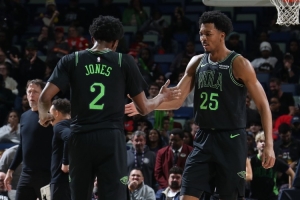 本场比赛,鹈鹕两位锋线墨菲和琼斯进攻端都毫无状态,尤其是外线各种机会就是投不进。墨菲20中3,三分11中1,罚球5中3拿到10分5篮板5助攻3抢断1盖帽;琼斯则是12中3,三分9中1,罚球2中2拿到9分5篮板5助攻2抢断2盖帽。