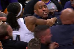 双方众人迅速集结,奥尼尔推了一把杰明,曼恩又上前推奥尼尔!